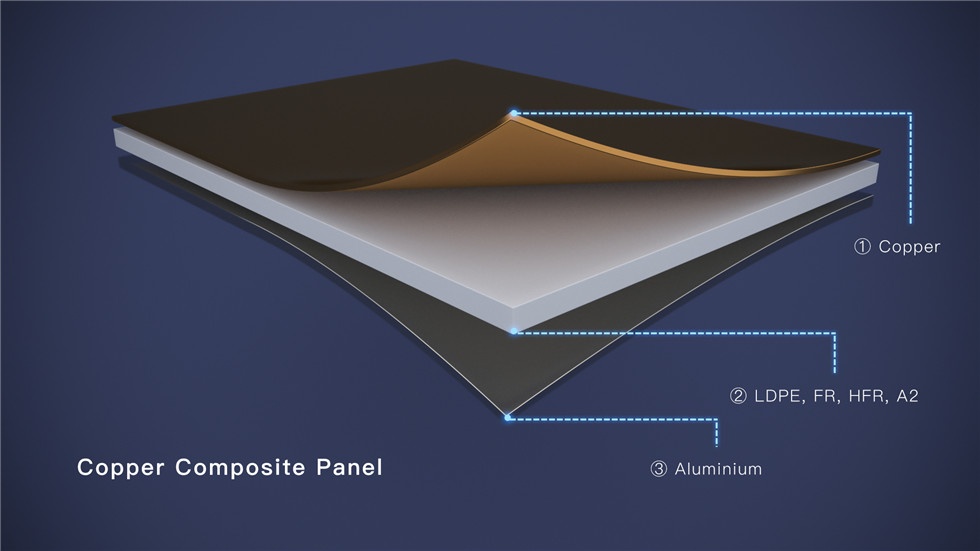 海天七彩銅復合板采用銅-塑-鋁復合,表面平整,易于加工成型,比單銅板節(jié)省大量珍貴銅材。本色銅表面呈亮紅色,受自然氧化影響,會發(fā)生從亮紅→暗紅→古銅→綠銅的顏色變化,充分展現(xiàn)了銅裝飾顏色隨時間遷移而變化的生命特性。若表面涂有耐指紋透明漆可延緩顏色的變化進程。銅表面還可人工氧化著色處理成古銅色、青銅色或綠銅色。