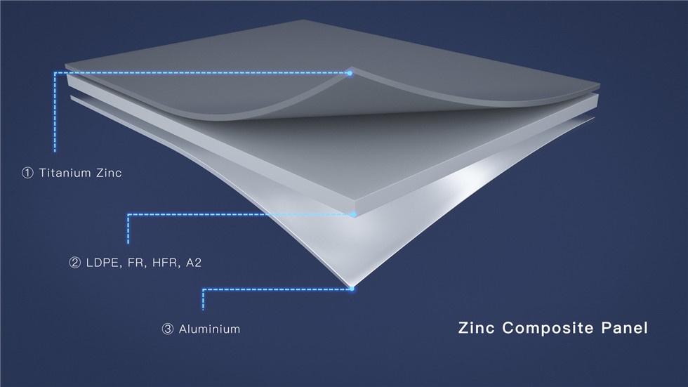 海天七彩鈦鋅復(fù)合板以鈦鋅合金為面板,鋁做為背板,高壓低密度聚乙烯為芯材,經(jīng)熱復(fù)合而形成的一種新型高檔建筑裝飾材料。在不同材料的復(fù)合過程中,未使用膠水或粘合劑,中間的芯層可選用燃燒性能更佳的礦物質(zhì)防火芯層,如B1級(jí)和A2級(jí)防火芯材。
